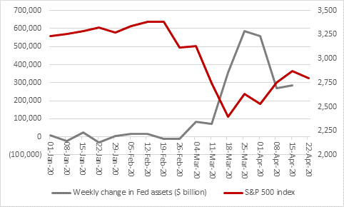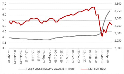 - Hopes for the V-shaped recovery are being fired by talk in America that the lockdown may soon be eased, as well as colossal fiscal and monetary stimulus. Interest rate cuts from the US Federal Reserve and its return to Quantitative Easing, whereby the US central banks has grown the assets on its balance sheet by $2.2 trillion or 53% in just six weeks, also provide financial markets with dollops of cheap liquidity with which they can speculate. This may be the most powerful factor of all in the US stock market’s bounce from the 23 March low and the hardest for sceptics of American equities to fight.