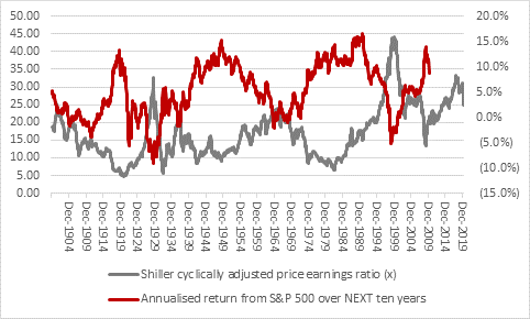 The S&P500 has only traded at 26 times earnings using CAPE for any length of time and ten-year compound annual returns from the index were negative after both 1929 and 1999.