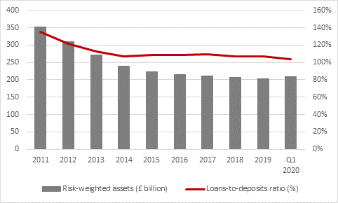 “It is therefore testament to the work put in my Mr Horta-Osorio and his team that Lloyds is still standing and in some ways stronger than ever. It has spun off non-core assets to either reduce complexity or appease regulators (or both) and emerged as a slimmer, more robust organisation. Total risk-weighted assets have fallen to £209 billion from £352 billion, the loan-to-deposit ratio has fallen to 104% from 135% and the common equity tier 1 (CET) ratio has improved from 10.8% to 14.2%, despite that buffeting from payments for past misdemeanours and bad loans during a period of tardy economic growth in the UK.