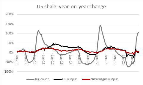 “US shale production is barely growing at the moment, either, so it will be interesting to see if output does ramp up in the coming months as those rigs get cracking, especially as production per rig is so much higher than it was a decade and more ago, although questions do still remain over depletion rates and how quickly rigs may need to shift from well to well.