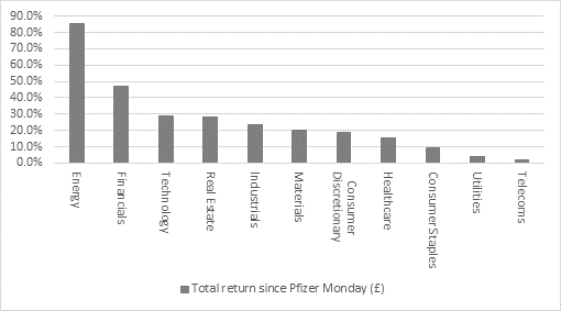 “The return to favour of Eastern Europe and the UK among investors is reflected in which equity sectors have done best since Pfizer Monday. Like the US, technology has continued to do well, offering a 29% total return in sterling terms, but also like the US it has been surpassed by two alternatives, in this case Energy and Financials.