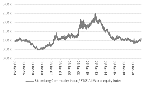 “First, the outperformance of equities relative to commodities over the past decade. Although ‘real’ assets have outperformed over past 12 months, they have not come close to making a dent in equities’ predominance. If inflation (or stagflation) do take hold, then that is not what markets are expecting or pricing in, so commodities, under that scenario could have a lot further to run.
