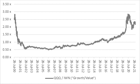 “The multi-trillion market caps of Facebook, Alphabet, Amazon, Apple and Microsoft continue to grab the headlines, but less highly-valued cyclicals are starting to rise more quickly, as can be seen in the last 18 months’ outperformance of the iShares Russell 2000 Value Index Exchange-Traded Fund (ticker IWN:NYSE) against the technology-and-growth laden Invesco QQQ Trust (ticker QQQ:NYSE).