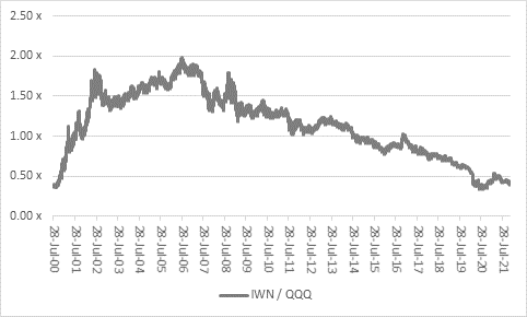 “If the line goes up, value is doing better, and vice-versa. Value’s latest attempt for glory is petering out a little, perhaps owing to worries over covid variants and the effects of higher prices and clogged supply chains on economic activity, although the heavy weighting within the iShares Russell 2000 Value ETF of meme stocks such as AMC Entertainment and Avis Budget may not be helping its cause, at least in the near term.