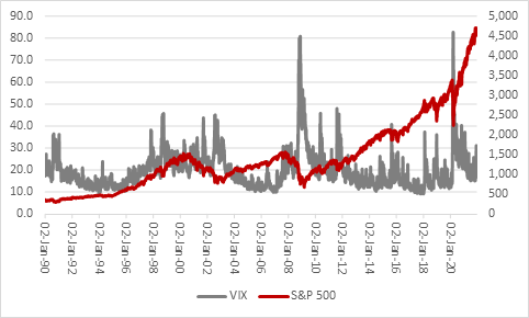 “After a brief foray to 30 on news of the Omicron variant, the VIX, or ‘fear,’ index which gauges future volatility in the US stock market, is trading barely above its long-run average of 19. If markets retain their faith in central bank control, inflation remains subdued and the variant passes by, fear will likely dissipate.