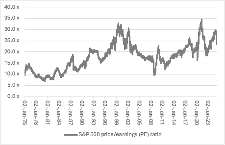In the last five years, the S&P 500’s price to earnings ratio reached a new peak, although it backed off quickly following the Covid pandemic. But the ratio has been on the rise again and touched 30 times price to earnings in 2024.