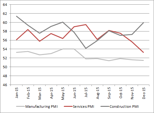 “Today’s services purchasing managers’ index (PMI) fell to 55.5 in December from 55.9 in November, marginally below the 2015 average of 56.6.