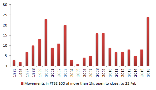 In just 36 trading days this year, the FTSE 100 has risen or fallen by more than 1% from open to close on 24 occasions, the most in any year going back to at least 1995 – and that is before any further uncertainty created by the run up to the EU referendum on 23 June.